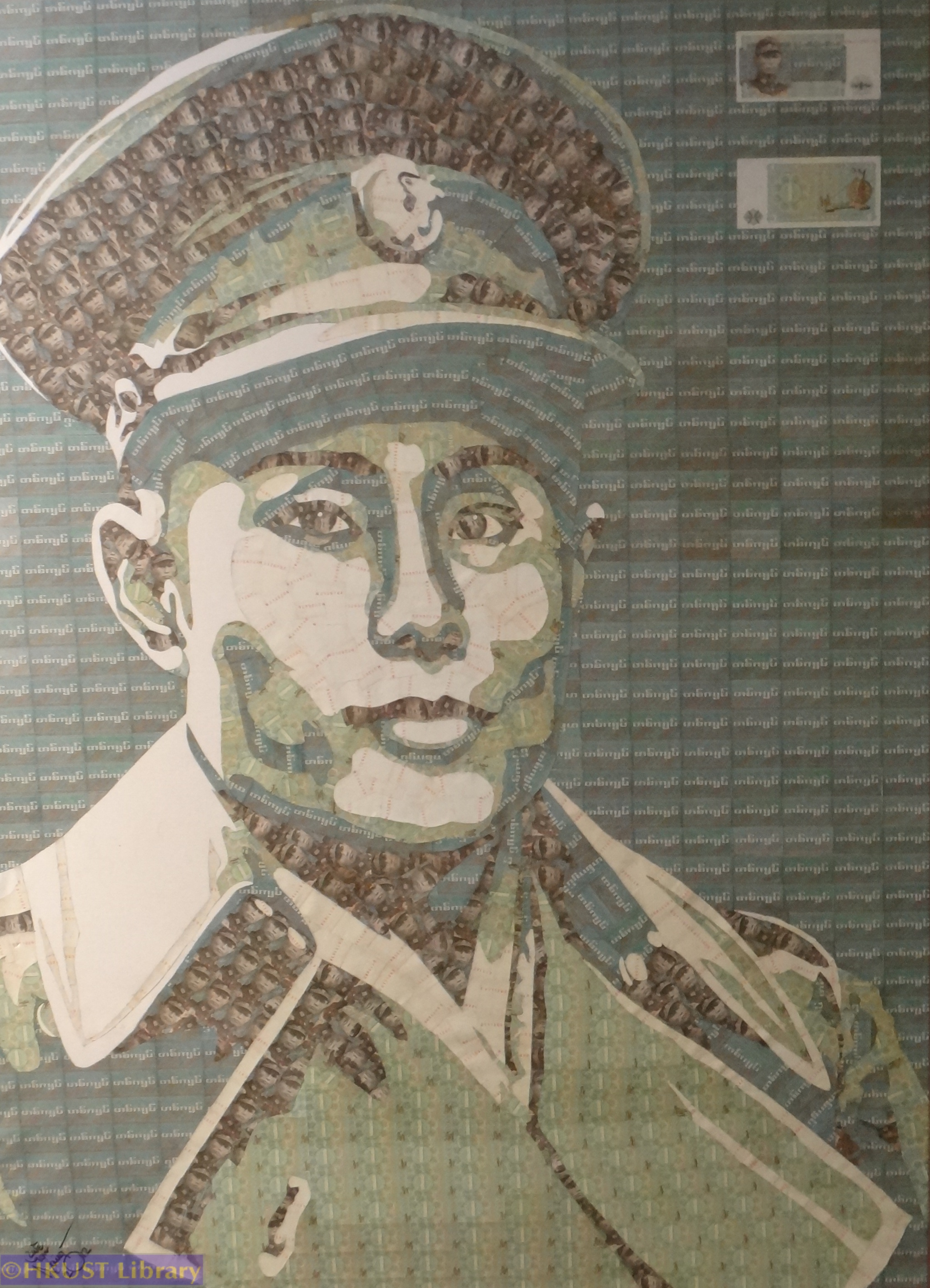 This collage of Aung San, made of banknotes bearing his own image, reproduces the most famous photo ever taken of him. The date is January 1947. The location is Downing Street, London. The occasion is a series of meetings with the British Government that delivered Burmese independence one year later. Aung San was assassinated by a political rival in July 1947.