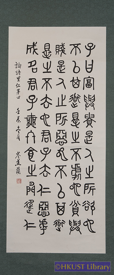 岑燕蘭 SHAM Yin Lan 節錄自論語里仁篇 篆書 Seal Script 186 x 52 cm 釋文: 子曰:富與貴,是人之所欲也,不以其道得之,不處也。貧與賤,是人之所惡也,不以其道得之,不去也。君子去仁,惡乎成名。君子無終食之間違仁。