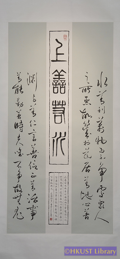周立平 CHOW Lup Ping Irene 節錄自道德經第八章 行草書 Cursive Running Script 210 x 82 cm 釋文 : 上善若水。水善利萬物而不爭,處眾人之所惡,故幾於道。居善地,心善淵,與善仁,言善信,政善治,事善能,動善時。夫唯不爭,故無尤。