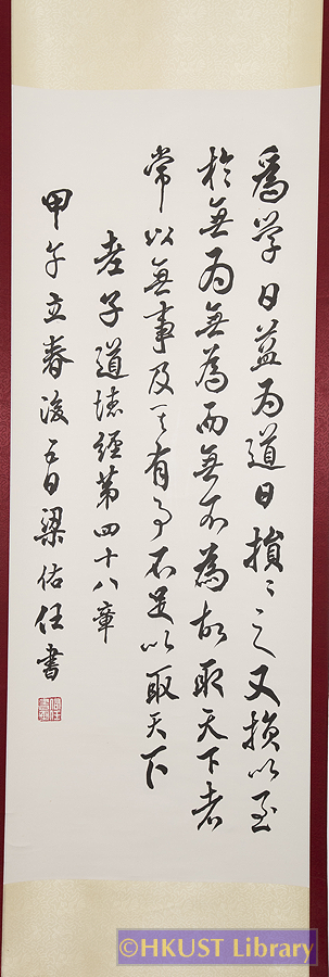 梁佑任 LEUNG Yau Yam 節錄自老子道德經第四十八章 行草書 Running Cursive Script 210 x 58 cm 釋文: 為學日益,為道日損。損之又損,以至於無為。無為而無不為。故取天下者常以無事,及其有事,不足以取天下。
