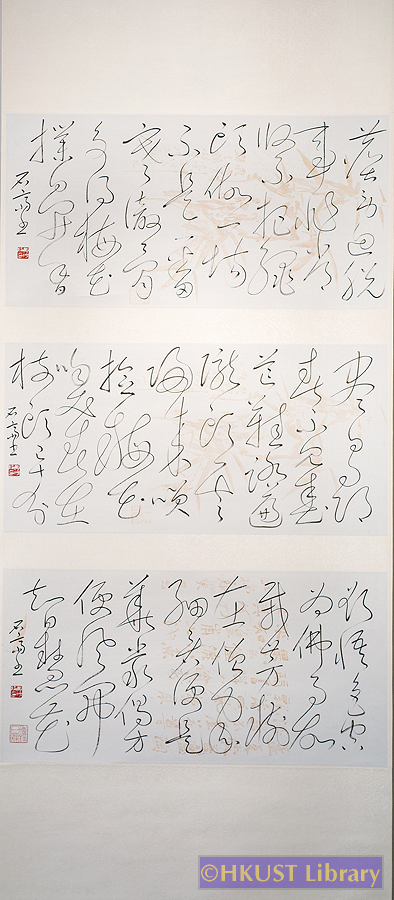 黃博錚 WONG Bok Tsang 禪詩三首 草書 Cursive Script 205 x 67 cm 釋文 : (1)黃檗希運上堂示法作:塵勞迴脫事非常,緊把繩頭做一場,不是一翻寒徹骨,爭得梅花撲鼻香。(2)宋某尼悟道詩: 盡日尋春不見春,芒鞋踏破嶺頭雲, 歸來偶把梅花嗅,春在枝頭已十分。(3)白居易: 欲悟色空為佛事,故栽芳樹在僧家;細看便是華嚴偈,方便風開智慧花。