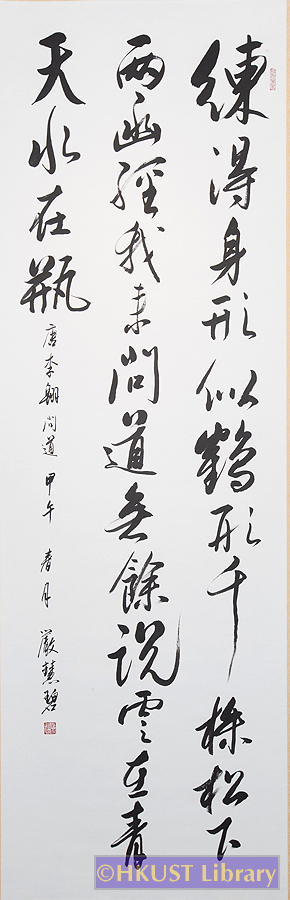 嚴慧碧 YIM Wai Pik 襌詩 (李翱問道) 行書 Running Script 210 x 58 cm 釋文: 練得身形似鶴形,千株松下兩函經。我來問道無余說,雲在青天水在瓶。