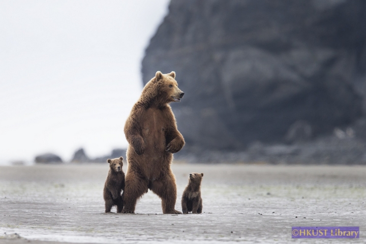 The brown bear family of three wakened in the presence of an intruding adult bear. Mom, flanked on both sides by cubs, walked out from the shelter of the big rock to explore the impending danger. Once out in the open, she rose to her full height and surveyed the surrounding area. Instinctively, the cubs stayed close at her side. One cub, nuzzled against her leg, while the other looked up at her questioningly. Both were aware that something was amiss. The image captured the vulnerability of the cubs and the intensity of the mother’s stance, determined to protect her young.