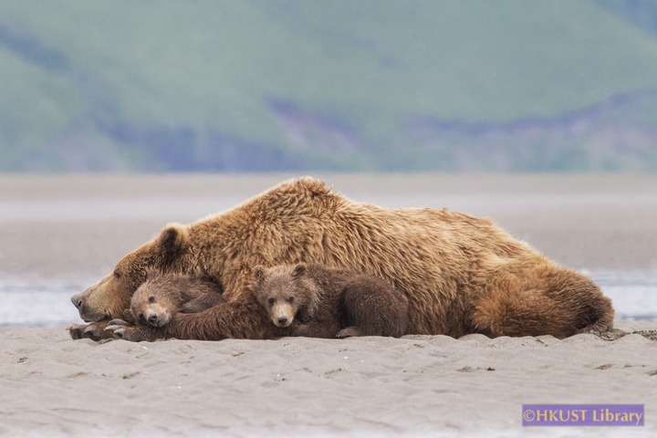 I witnessed this scene from afar, which immediately drew me with its affectionate tone. The mother brown bear and two cubs rested atop the soft sand, along the water’s edge and appeared oblivious to any visitors. One cub nestled against the mother’s neck, using her arm as a pillow and the other rested against her side and shoulder. I observed the interaction, careful not to draw attention, as I inched closer for the shot.