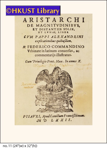 De Magnitudinibus, et Distantiis Solis, et Lunae, Liber cum Pappi Alexandrini explicationibus quibusdam. A Federico Commandino Urbinate in Latinum conversus, ac Commentariis illustratus. 4 p.l. (the last a blank), 38 leaves. Small 4to. Pesaro: apud C. Francischinum, 1572.